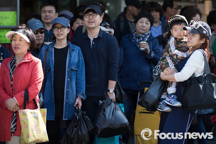 (서울=포커스뉴스) 20대 총선을 이틀 앞둔 11일 오후 서울 마포구 망원시장 일대에서 유권자들이 손혜원 더불어민주당 마포구을 후보의 선거유세를 지켜보고 있다.