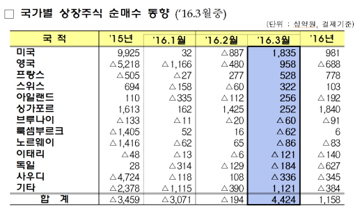 금융감독원은 지난 3월 외국인이 상장주식에 4조4000억원 순매수, 상장채권에 6000억원을 순투자하면서 총 5조원의 자금이 유입됐다고 11일 발표했다.