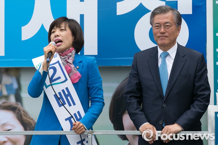 (부산=포커스뉴스) 문재인(오른쪽) 전 더불어민주당 대표가 11일 오후 부산시 사상구 가야대로 주례럭키아파트 앞에서 배재정 더불어민주당 사상 후보 지원유세를 하고 있다.