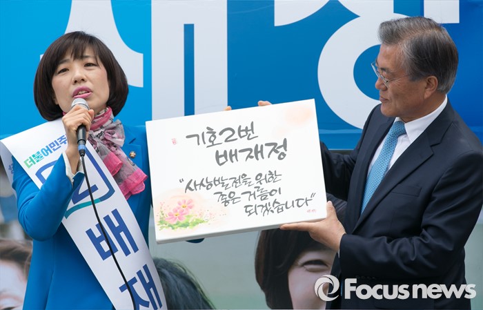 (부산=포커스뉴스) 문재인(오른쪽) 전 더불어민주당 대표가 11일 오후 부산시 사상구 가야대로 주례럭키아파트 앞에서 배재정 더불어민주당 사상 후보 지원유세 중, 배 후보가 택시기사로부터 선물받은 액자를 들고 있다.