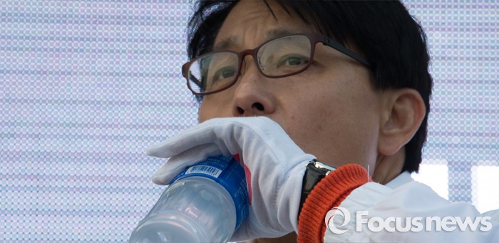 (인천=포커스뉴스) 20대 총선을 이틀 앞둔 11일 오후 인천 남구 제물포역 앞에서 윤상현 무소속 남구을 후보가 목을 축이고 있다.