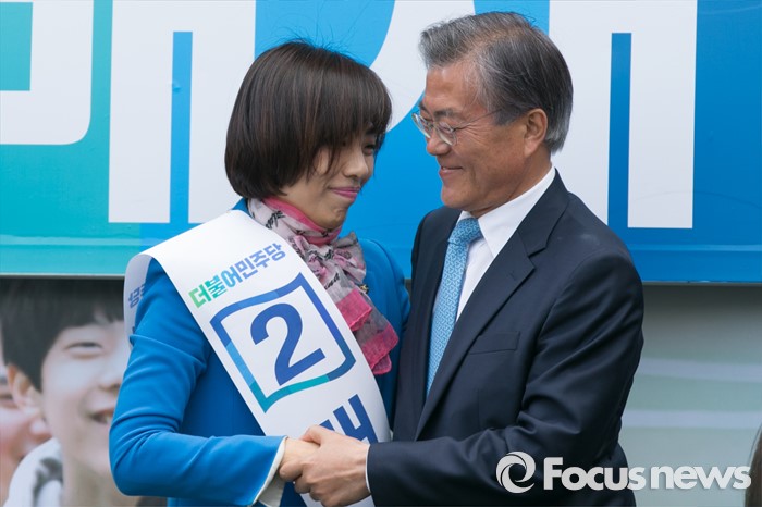 배 후보는 "통일민주당은 더불어민주당이 됐지만 기호 2번과 이름은 바뀌지 않았다"면서 "오늘 사상 거리 곳곳에서 저, 배재정이 그 분과 함께 사상 시민들을 만나겠다"고 밝혔다.문재인(오른쪽) 전 더불어민주당 대표가 11일 오후 부산시 사상구 가야대로 주례럭키아파트 앞에서 배재정 더불어민주당 사상 후보 지원유세에 참석해, 배 후보와 손을 잡고 있다. 2016.04.11 박철중 기자