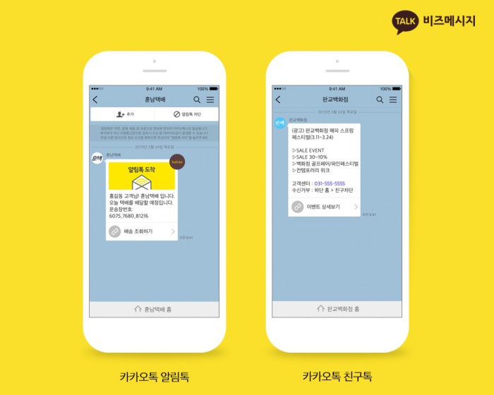 감철웅 카카오 메시지사업파트장은 "이번 친구톡 출시를 통해 기업 메시징 서비스에 완성도를 갖추게 됐다"며 "알림톡과 친구톡이 기업 고객과 문자중개사업자, 그리고 이용자의 만족도를 동시에 이끌어낼 수 있을 것이라 기대한다"고 말했다.알림톡, 친구톡 메시지 화면 <사진제공=카카오>