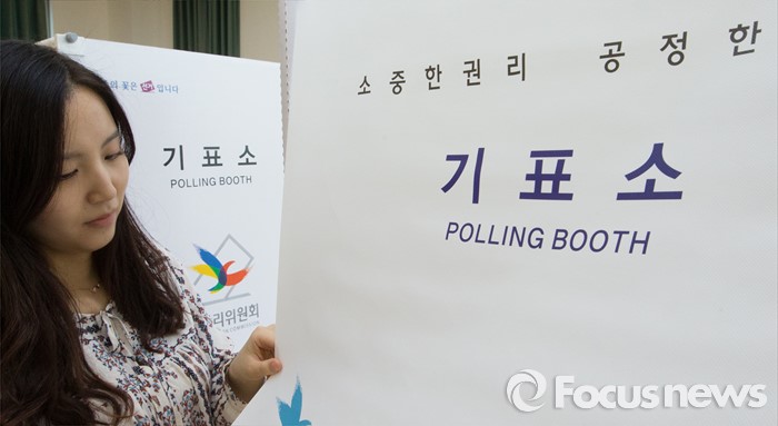 (세종=포커스뉴스) 20대 국회의원 선거를 하루 앞둔 12일 오전 세종시 조치원읍 세종시민체육관에 마련된 투표소에서 관계자들이 투표소 준비를 하고 있다.