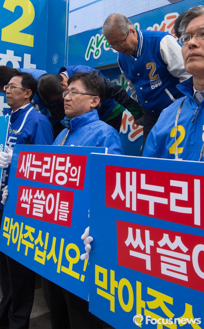 (청주=포커스뉴스) 국회의원 선거를 하루 앞둔 12일 오전 충북 청주 상당구 육거리시장 앞에서 김종인 더불어민주당 대표가 청주지역 후보의 지지를 호소하고 있다.