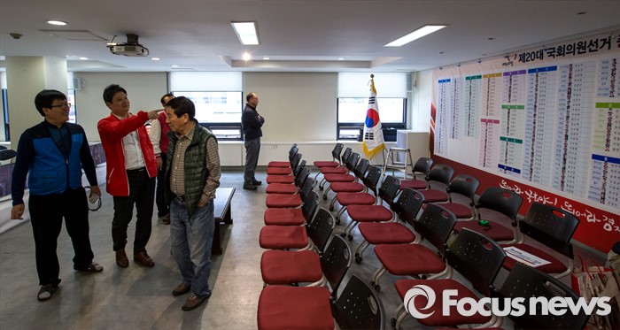 (서울=포커스뉴스) 제20대 국회의원선거를 하루 앞둔 12일 오전 서울 영등포구 새누리당사에서 관계자들이 선거상황실을 설치 하고 있다.