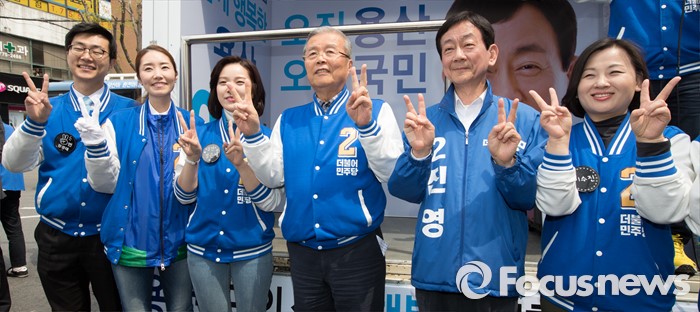 (서울=포커스뉴스) 2016 제20대 국회의원선거를 하루 앞둔 12일 오후 서울 용산구 후암시장 인근에서 김종인 더불어민주당 비대위 대표 겸 선대위원장과 진영 서울 용산구 후보가 유권자들에게 지지를 호소하고 있다.