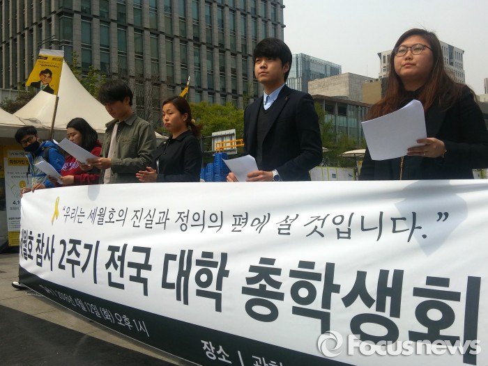 (서울=포커스뉴스) 세월호 참사 2주기를 앞두고 전국 대학의 총학생회 대표단이 12일 오후 1시 서울 광화문광장에서 기자회견을 열고 정부와 국회에 세월호 참사의 진상을 규명할 것을 촉구했다.
