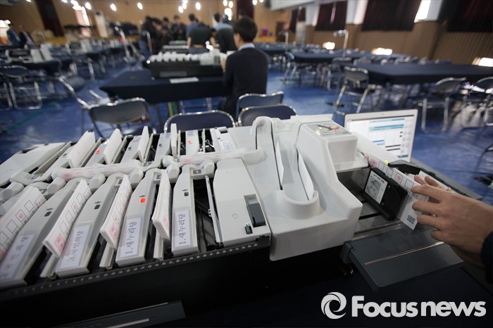 (서울=포커스뉴스) 4.13총선을 하루 앞둔 12일 오후 서울 영등포구 여의도고등학교 체육관에 마련된 개표소에서 선관위 관계자들이 투표지분류기를 점검하고 있다.