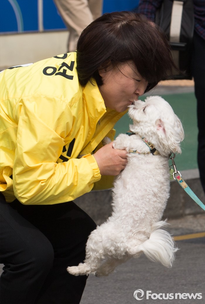 (고양=포커스뉴스) 제20대 국회의원 선거를 하루 앞둔 12일 오후 심상정 정의당 고양갑 후보가 경기 고양시 롯데마트 화정점 앞에서 유권자 애완견과 뽀뽀하고 있다.