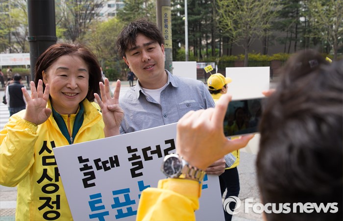 (고양=포커스뉴스) 제20대 국회의원 선거를 하루 앞둔 12일 오후 심상정 정의당 고양갑 후보가 경기 고양시 롯데마트 화정점 앞에서 한 시민과 기념촬영 하고 있다.