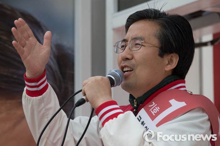 (고양=포커스뉴스) 제20대 국회의원 선거를 하루 앞둔 12일 오후 경기도 고양시 화정역 앞에서 손범규 새누리당 고양갑 후보가 유권자들에게 지지호소 하고 있다.