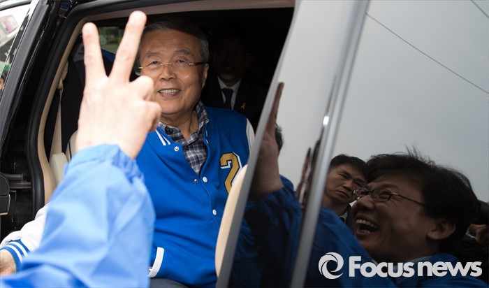 (서울=포커스뉴스) 2016 제20대 국회의원선거를 하루 앞둔 12일 오후 서울 강서구 발산역 인근에서 김종인 더불어민주당 비대위 대표 겸 선대위원장이 금태섭 강서갑 후보, 진성준 강서을 후보, 한정애 강서병 후보와 유세를 마치고 이동하고 있다.