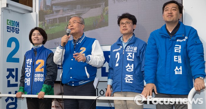 (서울=포커스뉴스) 2016 제20대 국회의원선거를 하루 앞둔 12일 오후 서울 강서구 발산역 인근에서 금태섭 더불어민주당 강서갑 후보, 진성준 강서을 후보, 김종인 비대위 대표 겸 선대위원장, 한정애 강서병 후보가 유권자들에게 지지를 호소하고 있다.