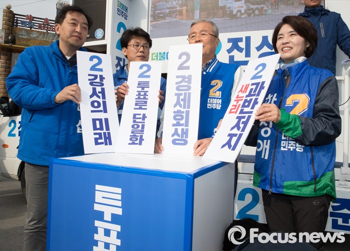 (서울=포커스뉴스) 2016 제20대 국회의원선거를 하루 앞둔 12일 오후 서울 강서구 발산역 인근에서 금태섭 더불어민주당 강서갑 후보, 진성준 강서을 후보, 김종인 비대위 대표 겸 선대위원장, 한정애 강서병 후보가 퍼포먼스를 하고 있다.