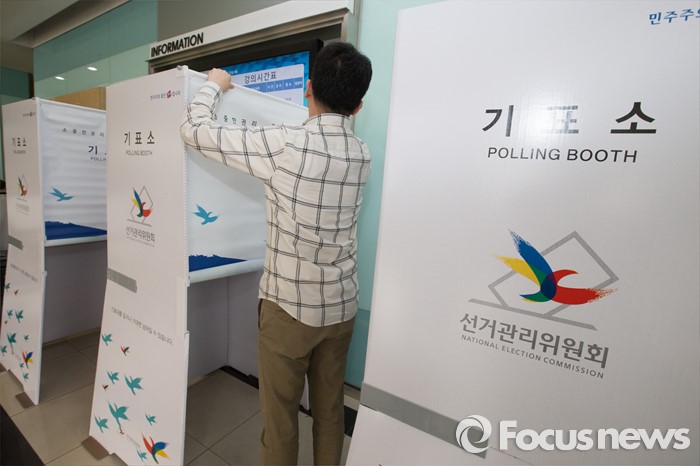 (서울=포커스뉴스) 4.13총선을 하루 앞둔 12일 오후 서울 성북구 보험연수원에 마련된 보문동 제2투표소에서 투표사무원이 기표소를 설치하고 있다.