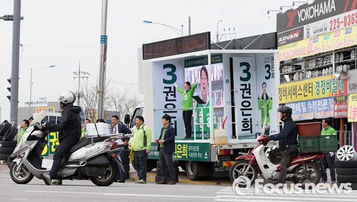 (광주=포커스뉴스) 4.13총선을 하루 앞둔 12일 오후 광주 광산구 타이어테크 수완점 앞에서 권은희 국민의당 광산구을 후보가 선거유세를 하고 있다.