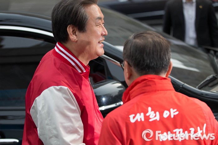 (서울=포커스뉴스) 20대 총선을 하루 앞둔 12일 오후 서울 용산구의 한 아파트 일대에서 김무성 새누리당 대표가 안대희 마포갑 후보 지원유세를 하고 있다.