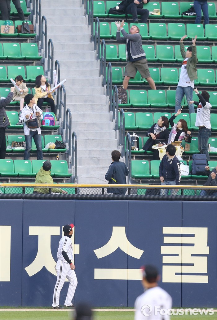 (서울=포커스뉴스) 12일 서울 잠실구장에서 열린 2016 프로야구 롯데-LG 경기 1회초 2사 2루에서 LG 좌익수 채은성이 롯데 강민호의 홈런 타구를 바라보고 있다. 외야의 한 관중이 홈런 타구를 맨손으로 잡으려 하고 있다.