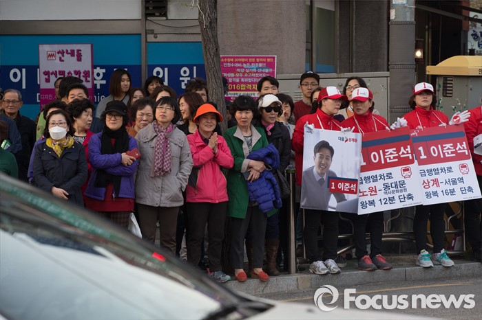 (서울=포커스뉴스) 12일 오후 서울 노원구 GS수퍼마켓 상계점 앞에서 시민들이 이준석 새누리당 노원병 후보자를 지지하는 김무성 새누리당 대표의 발언을 듣고 있다.