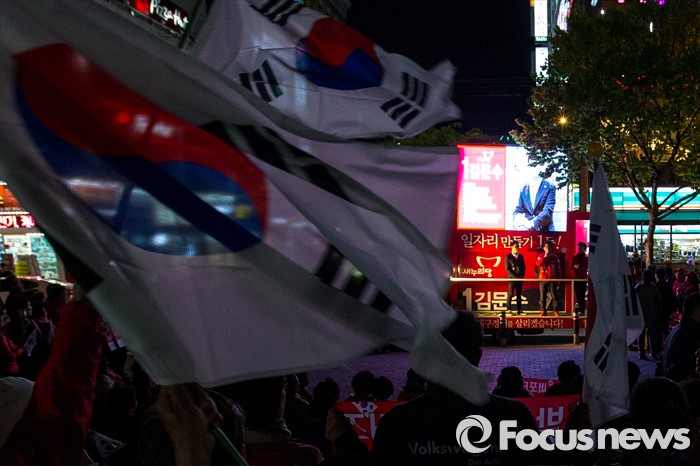 (대구=포커스뉴스) 김문수 새누리당 대구 수성구갑 후보가 12일 오후 대구광역시 수성구 신매광장에서 유세를하며 유권자들에게 한 표를 호소 하고 있다.