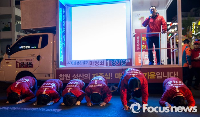(창원=포커스뉴스) 4.13총선 선거운동 마지막날인 12일 오후 경남 창원시 상남분수광장에서 강기윤 새누리당 창원 성산구 후보가 유권자들의 지지를 호소하는 큰절을 하고 있다.