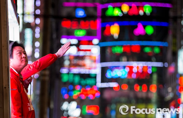 (창원=포커스뉴스) 4.13총선 선거운동 마지막날인 12일 오후 경남 창원시 상남분수광장에서 강기윤 새누리당 창원 성산구 후보가 유권자들의 지지를 호소하고 있다.