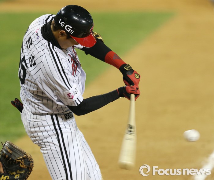 (서울=포커스뉴스) 12일 서울 잠실구장에서 열린 2016 프로야구 롯데-LG 경기 6회말 2사 만루에서 LG 채은성이 유격수쪽 내야안타를 날리고 있다.