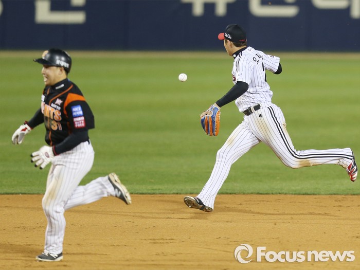 (서울=포커스뉴스) 12일 서울 잠실구장에서 열린 2016 프로야구 롯데-LG 경기 9회 1사 1,2루에서 롯데 황재균의 내야안타때 LG 유격수 오지환이 볼을 쫓고 있다.