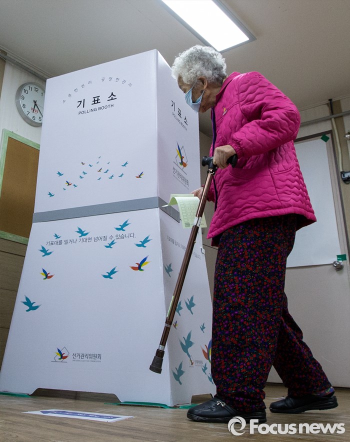 (부산=포커스뉴스) 제20대 국회의원선거일인 13일 오전 부산 영도구 동삼1동 제6투표소에서 지팡이를 짚은 노인이 기표소로 향하고 있다.