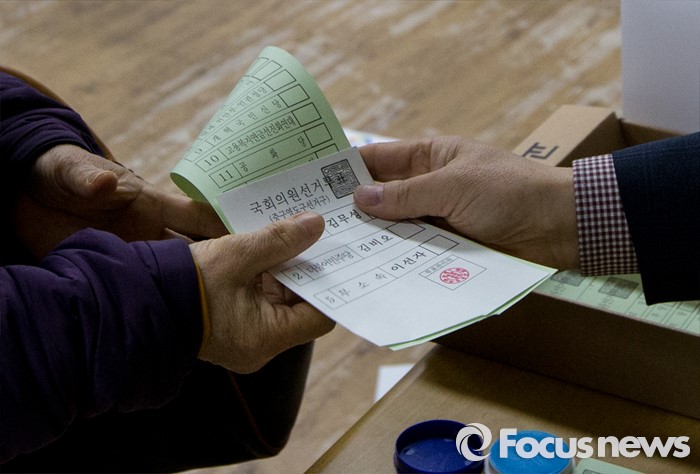 (부산=포커스뉴스) 제20대 국회의원선거일인 13일 오전 부산 영도구 동삼1동 제6투표소에서 유권자들이 투표용지를 받고 있다.