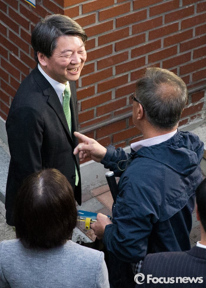 (서울=포커스뉴스) 안철수 국민의당 상임공동대표가 제20대 국회의원 선거일인 13일 오전 서울 노원구 상계1동 제7투표소 앞에서 한 주민과 대화를 나누고 있다.