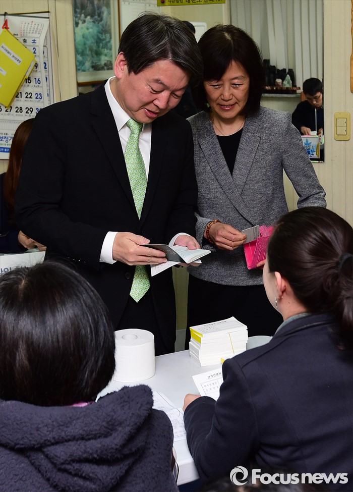 (서울=포커스뉴스) 안철수 국민의당 상임공동대표가 제20대 국회의원선거날인 13일 서울 노원구 상계1동 제7투표소에서 부인 김미경 씨와 투표하기 위해 본인확인을 하고 있다.