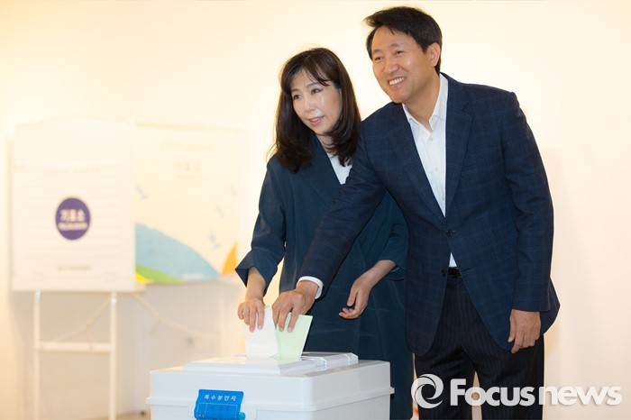 (서울=포커스뉴스) 2016 제20대 국회의원선거날인 13일 오전 서울 종로구 동성고등학교 백주년기념관에 설치된 투표소에서 오세훈 새누리당 종로 후보와 부인인 송현옥 씨가 투표를 하고 있다.