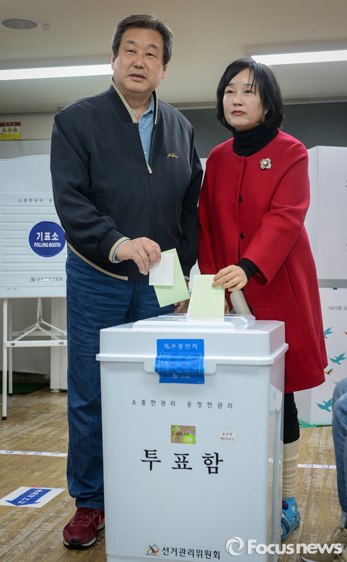 (부산=포커스뉴스) 제20대 국회의원선거일인 13일 오전 부산 영도구 동삼1동 제6투표소에서 김무성 새누리당 대표와 아내 최양옥 씨가 투표하고 있다.