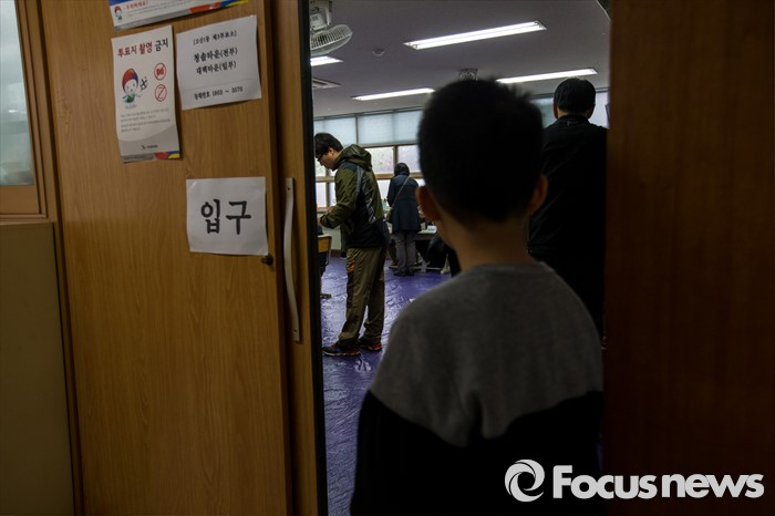 (대구=포커스뉴스) 제20대 국회의원선거날인 13일 오전 대구 수성구 청림초등학교에 마련된 투표소에서 한 어린이가 아버지의 투표하는 모습을 보고 있다.