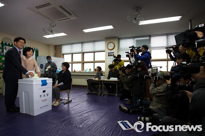(대구=포커스뉴스) 제20대 국회의원선거날인 13일 오전 대구 수성구 청림초등학교에 마련된 투표소에서 김문수 새누리당 대구 수성구갑 후보가 투표를 하고 있다.