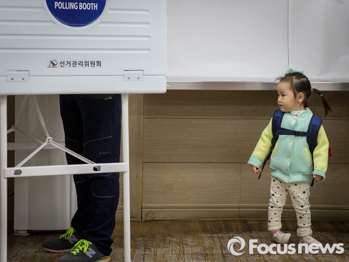 (부산=포커스뉴스) 제20대 국회의원선거일인 13일 오전 부산 영도구 동삼1동 제6투표소에서 한 어린이가 아빠의 투표를 기다리고 있다.