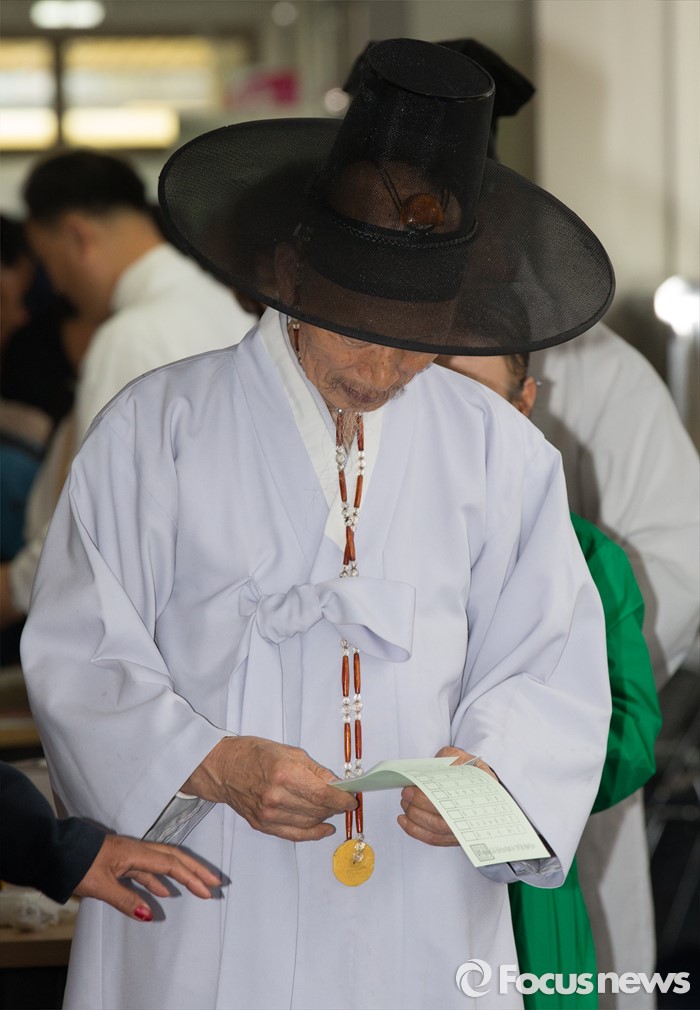 (논산=포커스뉴스) 제20대 국회의원 선거가 시작된 13일 오전 충남 논산 연산면 제1투표소에서 양지서당 유복엽 큰 훈장이 투표지를 바라보고 있다.