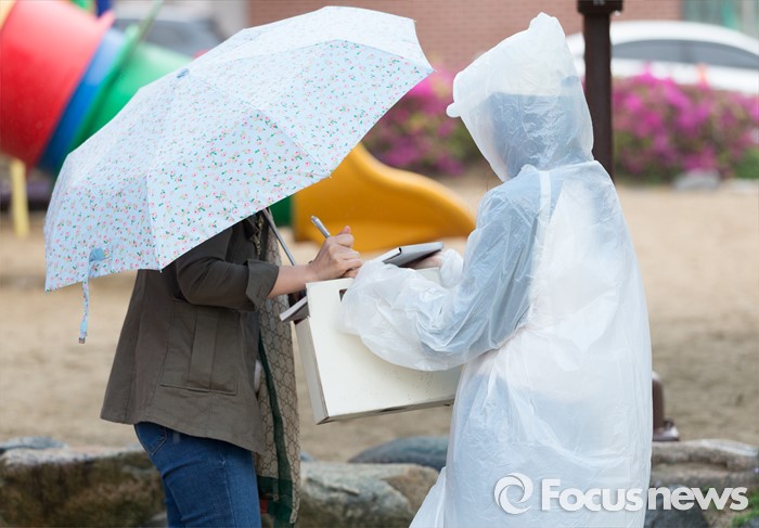 (광주=포커스뉴스) 제20대 국회의원 선거일인 13일 오전 광주 광산구 산월동 봉산초등학교에서 출구조사 방송관계자들이 출구조사를 하고 있다.