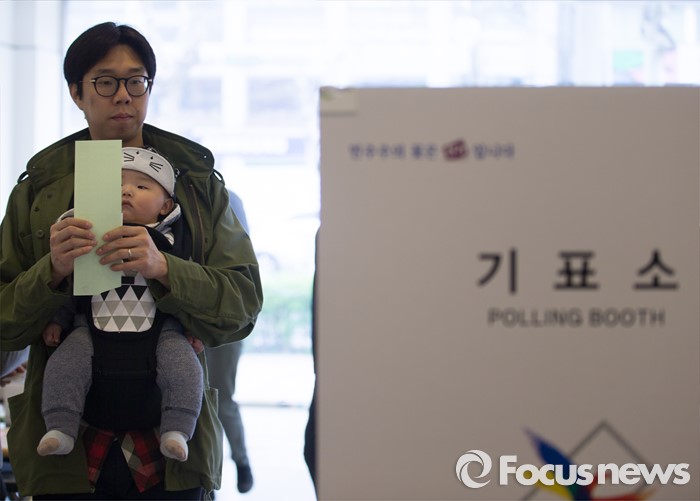 (서울=포커스뉴스) 제20대 국회의원선거일인 13일 오전 서울 광진구 능동 제3투표소에서 한 유권자가 아이와 함께 기표소로 향하고 있다.