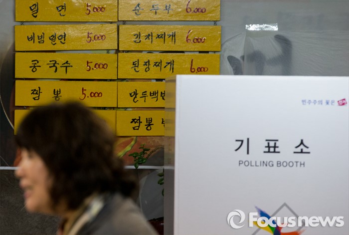 (부산=포커스뉴스) 제20대 국회의원선거일인 13일 오전 부산 사하구 하단1동 제1투표소의 기표소 너머 메뉴판이 보이고 있다. 이 투표소는 하단전통시장 내 한 밀면 음식점에 마련됐다.