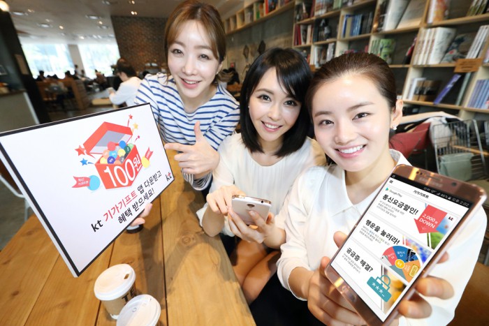 김학준 KT 플랫폼서비스개발담당 상무는 "기가기프트 for KT 앱은 고객 혜택을 위해 업계 최초로 통신사가 구글과 마케팅 분야에서 협력한 새로운 시도라는데 의미가 있다"며, "구글플레이를 사용하는 KT 고객들에게 더 많은 혜택을 제공하기 위해 콘텐츠업체들과 다양한 협업 프로모션을 진행할 예정"이라고 말했다.사진은 모델들이 '기가기프트 for KT' 앱 출시를 기념해 5월 31일까지 진행하는 통신 요금 할인 및 경품 증정 이벤트를 소개하는 모습 <사진제공=KT>