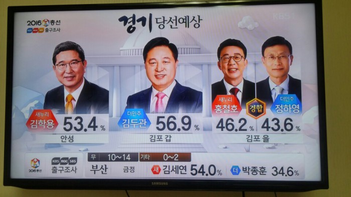 (서울=포커스뉴스) 13일 오후 6시 KBS·MBC·SBS 지상파 방송3사가 공동조사, 발표한 4·13 총선 출구조사 결과에 따르면 경기 안성에서는 새누리당 김학용 후보가 53.4%로 당선이 유력한 것으로 나타났다.