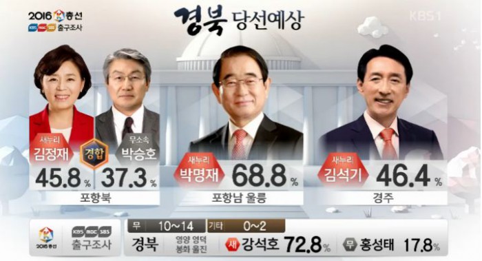 (서울=포커스뉴스)13일 오후 6시 KBS·MBC·SBS 지상파 방송3사가 공동조사, 발표한 4·13 총선 출구조사 결과에 따르면 경북 포항남·울릉 지역구에서는 박명재 새누리당 후보가 68.8%로 당선이 유력한 것으로 나타났다.<사진출처=KBS 출구방송 화면캡쳐>