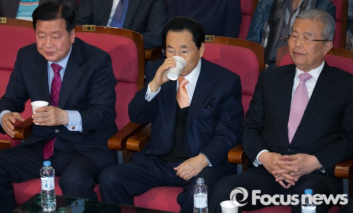 (서울=포커스뉴스) 20대 총선 투표일인 13일 오후 서울 여의도 국회 의원회관 대회의실에 마련된 더불어민주당 개표상황실에서 이근식(왼쪽), 송현섭(가운데) 선대위 부위원장이 물을 마시고 있다. 오른쪽은 김종인 비대위 대표 겸 선대위원장.