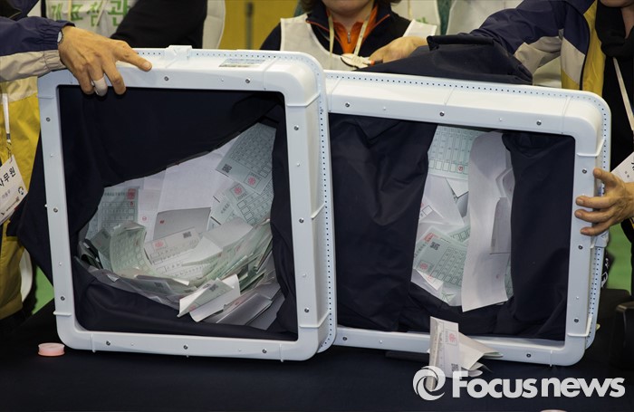 (서울=포커스뉴스) 제20대 국회의원선거일인 13일 오후 서울 종로구 경기상업고등학교 체육관에 마련된 개표소에서 종로구 선거관리위원회 관계자들이 사전투표함을 개봉하고 있다.