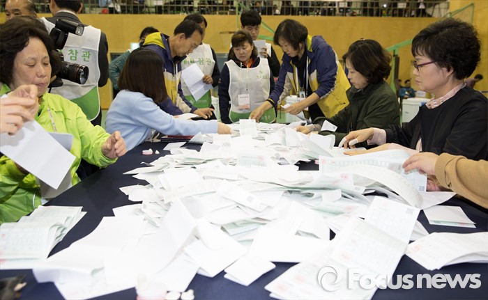 (서울=포커스뉴스) 제20대 국회의원선거일인 13일 오후 서울 종로구 경기상업고등학교 체육관에 마련된 개표소에서 종로구 선거관리위원회 관계자들이 개표하고 있다.