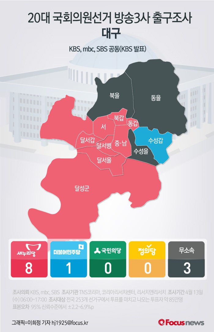 경합지역은 1개 지역으로 나타났다.(서울=포커스뉴스) KBS·mbc·SBS 지상파 방송 3사 공동 출구조사 결과 대구에서 새누리당은 8곳, 무소속 3곳, 더불어민주당이 1곳에서 우세를 예측했다. 2016.04.13 이희정 기자