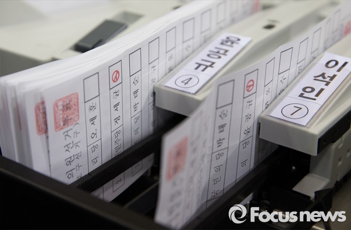 (서울=포커스뉴스) 제20대 국회의원선거일인 13일 오후 서울 종로구 경기상업고등학교 체육관에 마련된 개표소에서 전자개표기가 투표용지를 분류하고 있다.